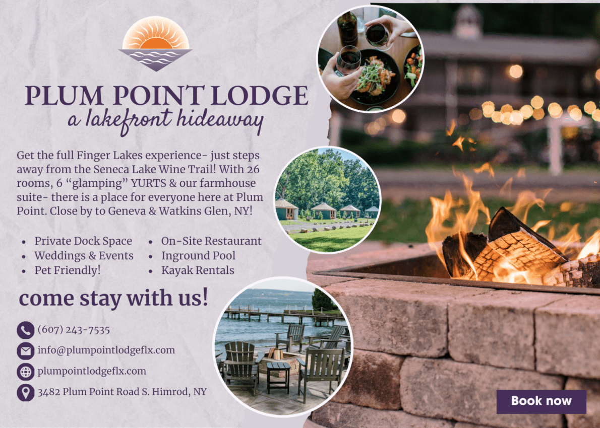 Plum Point Lodge is an exceptional lakefront hideaway on the Western shore of Seneca Lake in the literal heart of the Finger Lakes, steps from the Seneca Lake Wine Trail. We offer 31 guest rooms, 6 glamping yurts, a restaurant, bar, lounge, pool, dedicated events building, and 300 feet of accessible lakefront with a stunning view.